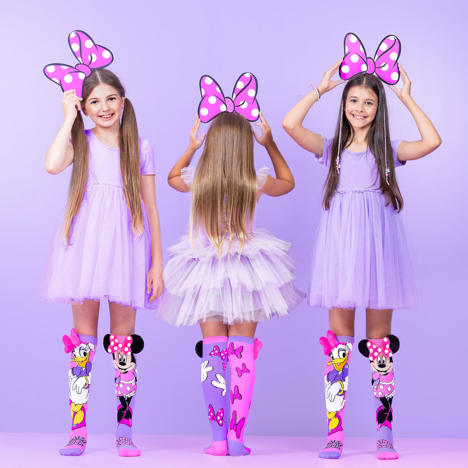 Introducing our adorable Minnie and Daisy Socks featuring the signature bow of both Minnie and Daisy as a custom-made 3D plush! What a fun spin on classic cartoon characters. Step into the world of Disney’s Mickey Mouse and Friends! It's a world of laughter, joy, and Disney magic, all in one pair of fun socks! 🐣🎉🌸